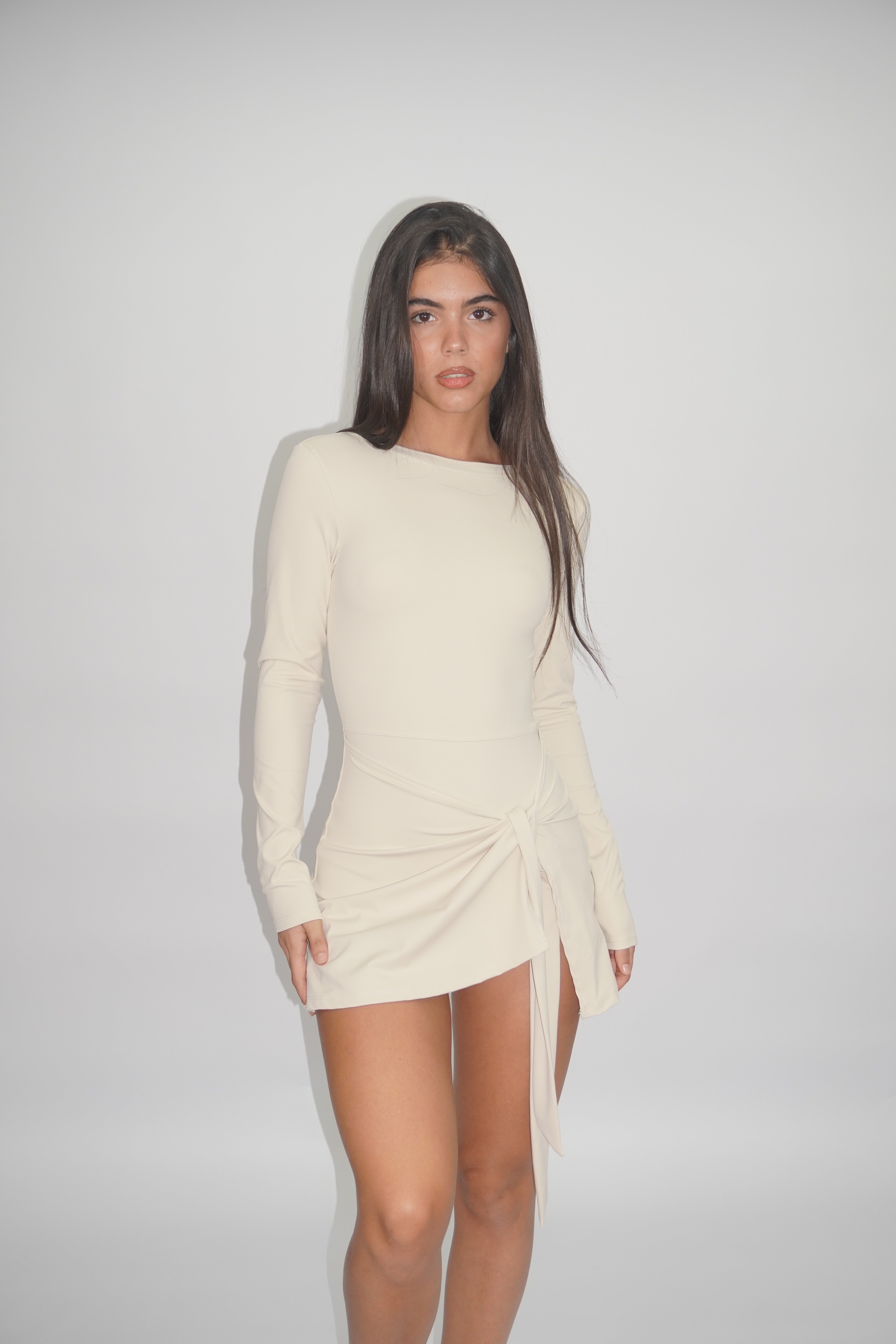 Il taglio a maniche lunghe lo rende elegante e versatile, mentre il dettaglio fiocco laterale aggiunge un tocco femminile e moderno. Sotto la gonna si nasconde un pantaloncino integrato, perfetto per muoversi in totale sicurezza e libertà senza rinunciare alla silhouette slanciata.