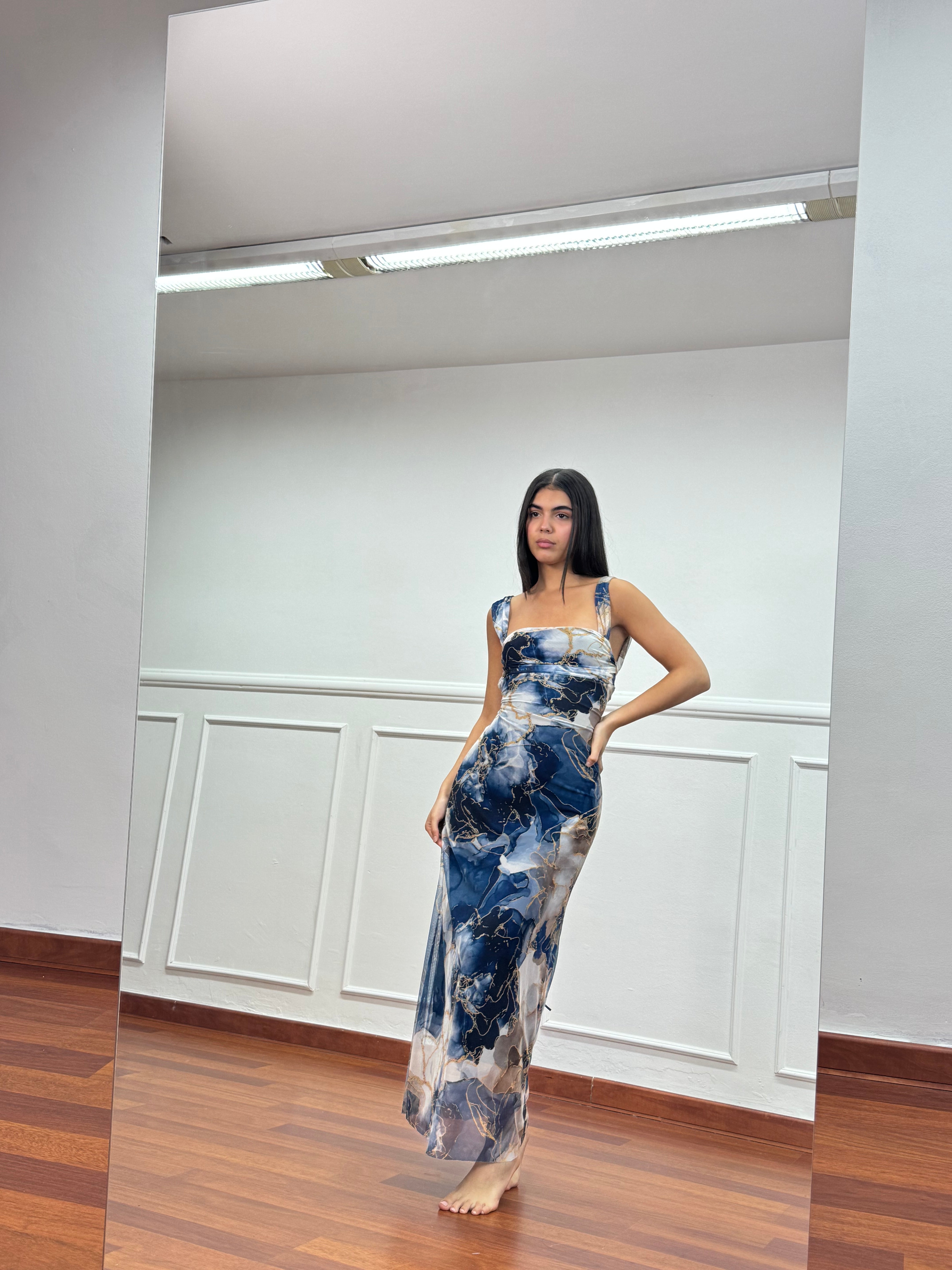 Questo abito lungo presenta bellissime sfumature blu che donano un tocco di originalità e eleganza al tuo look. Realizzato con tessuti di alta qualità, questo abito ti garantirà un comfort senza pari, rendendolo la scelta perfetta per ogni occasione. Non passare inosservato con Abito Blue.