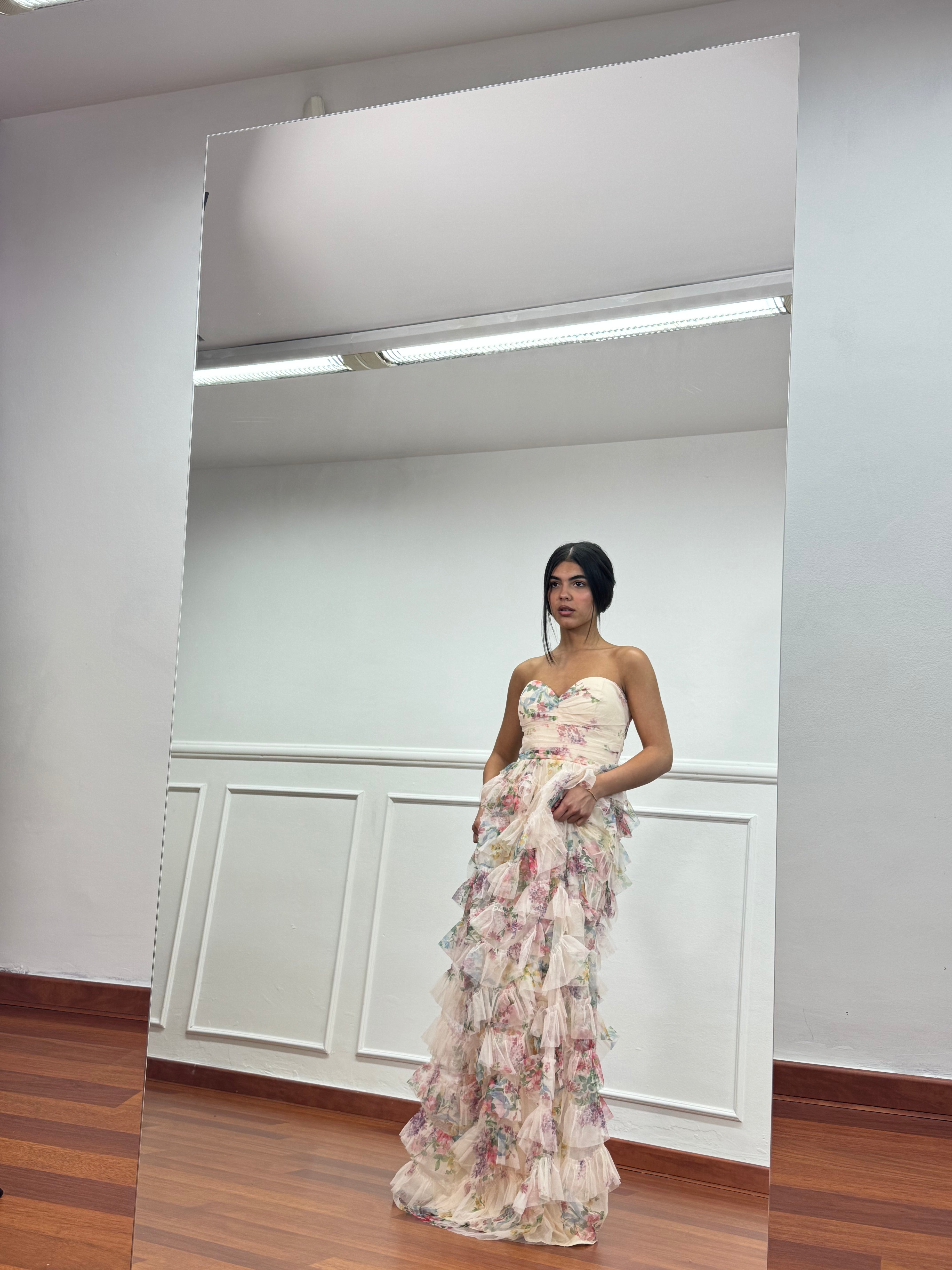 Scopri il tuo stile unico con l'Abito Ischia. Questo elegante abito presenta una gonna a blusa lunga e una graziosa fantasia a fiori, perfetto per un evento speciale. Fatti notare con questo capo dallo stile raffinato e femminile.