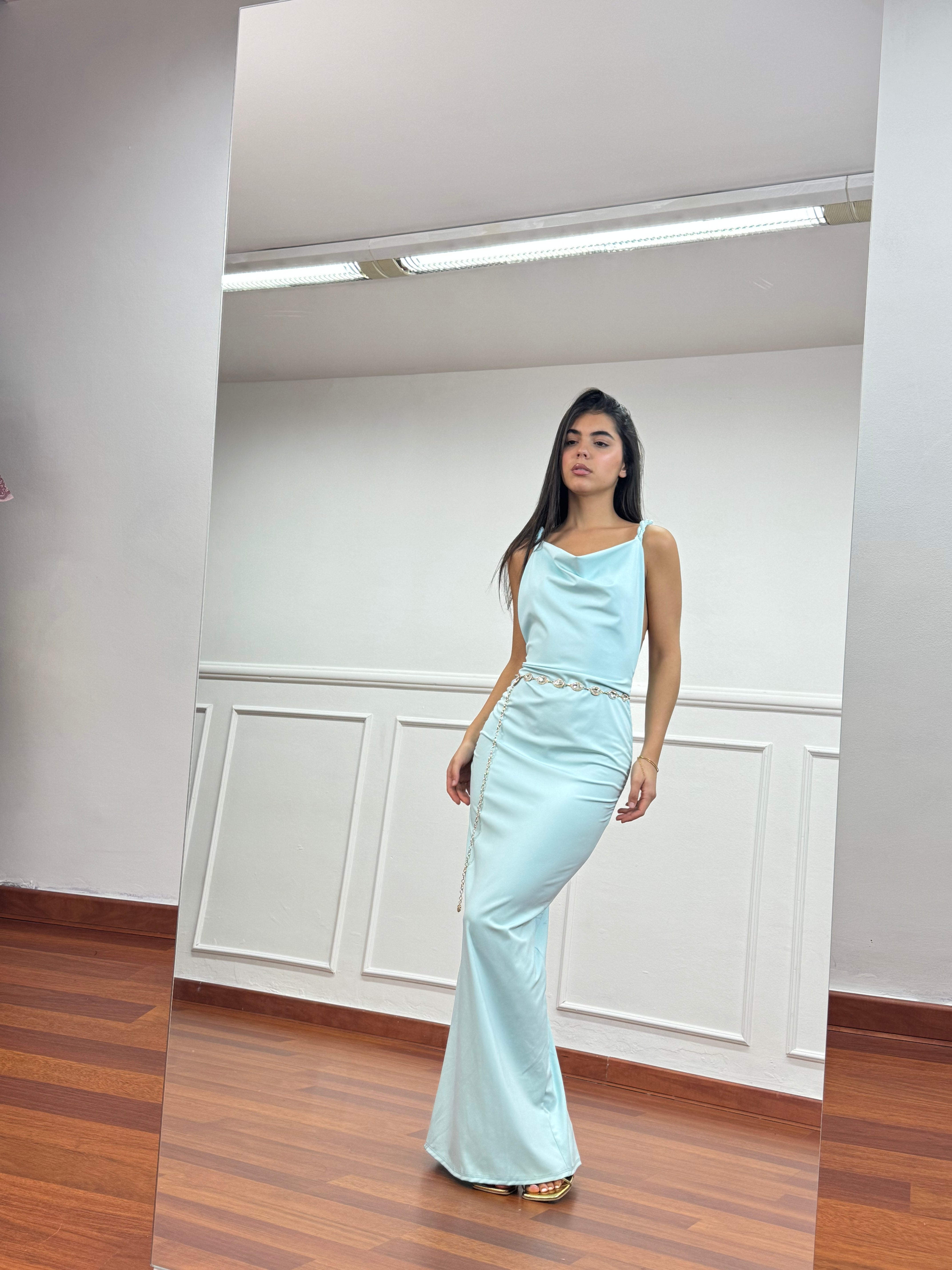Questo elegante abito lungo di colore acqua marina è perfetto per ogni occasione. Realizzato con tessuti di alta qualità, ti garantirà un comfort e una vestibilità impeccabile. La sua tonalità rilassante e il design sofisticato ti faranno risaltare in ogni situazione. Aggiungi un tocco di classe al tuo guardaroba con l'Abito Marina.