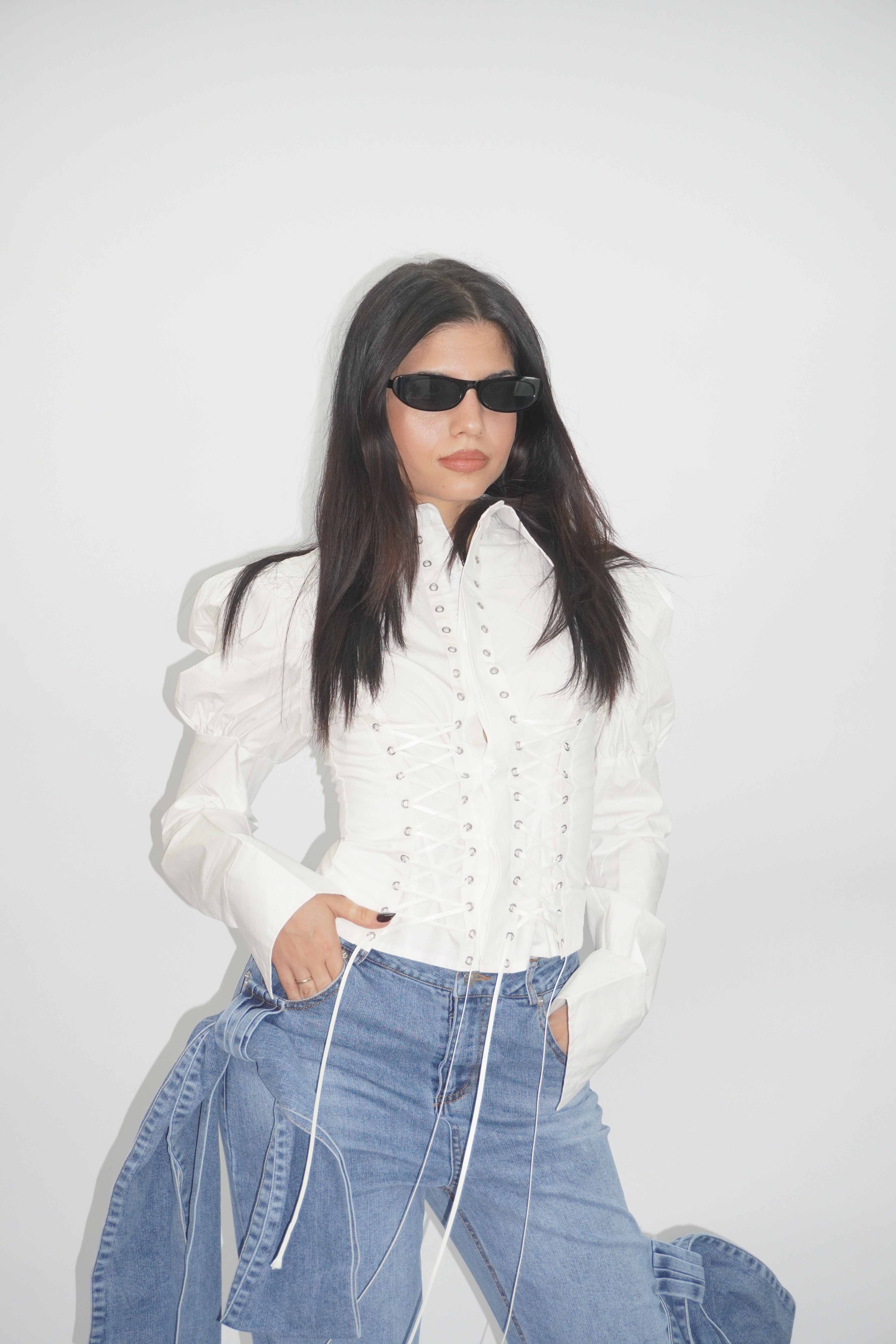 Un capo statement che fonde eleganza e carattere. Questa camicia bianca strutturata reinterpreta il classico in chiave contemporanea grazie a dettagli ispirati al corsetteria couture.
