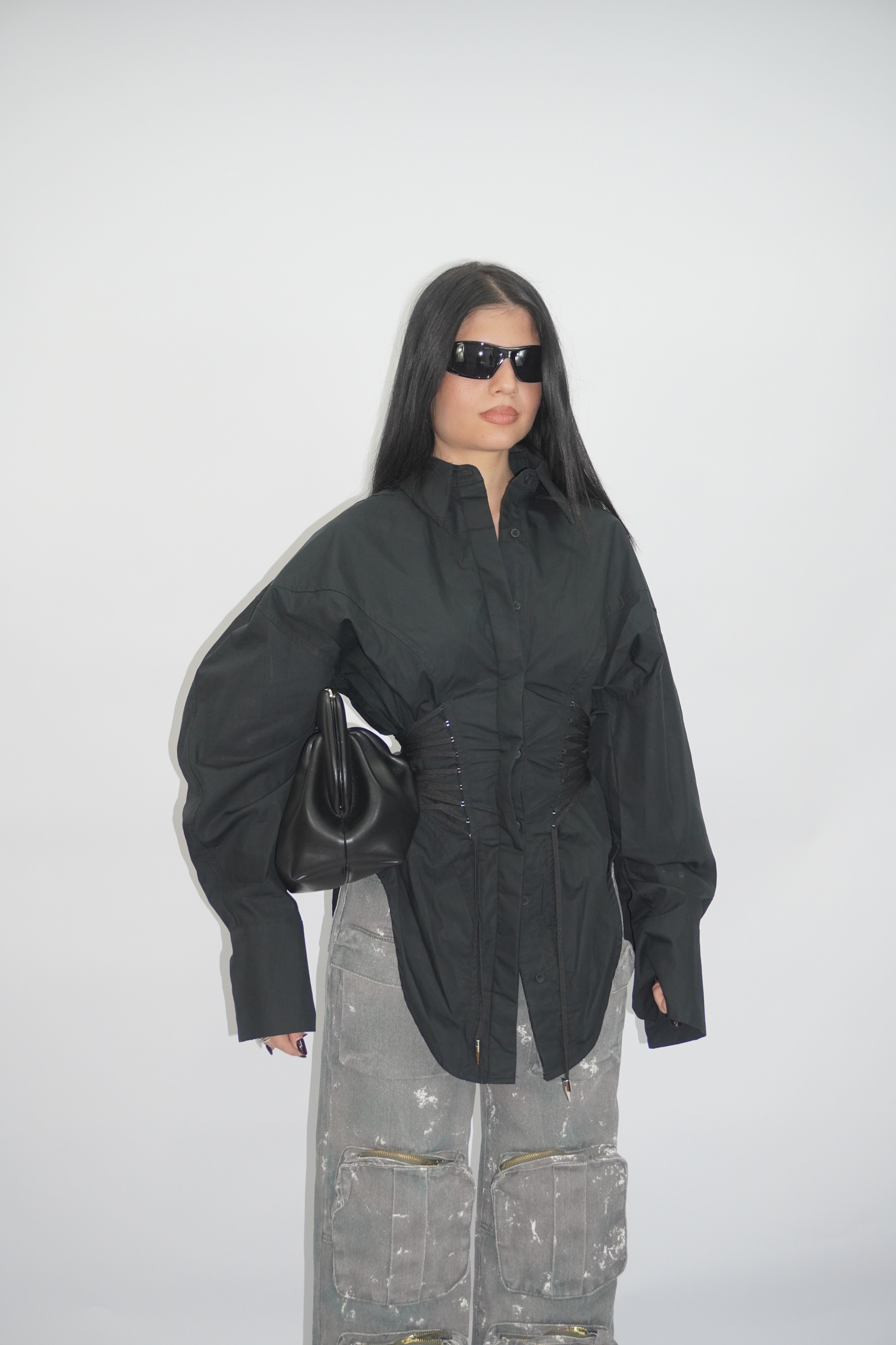 Un capo iconico che ridefinisce i volumi con eleganza e carattere. Questa camicia nera di alta qualità è realizzata in un tessuto tecnico dal taglio sartoriale e presenta un bustino integrato con lacci laterali che stringe il punto vita, scolpendo la silhouette con precisione. L’effetto è quello di una camicia corsetto, sofisticata e allo stesso tempo urban-chic. Le maniche ampie e strutturate, insieme al colletto classico e al taglio allungato sul fondo, aggiungono un tocco fashion-forward perfetto per outfit audaci ma raffinati.