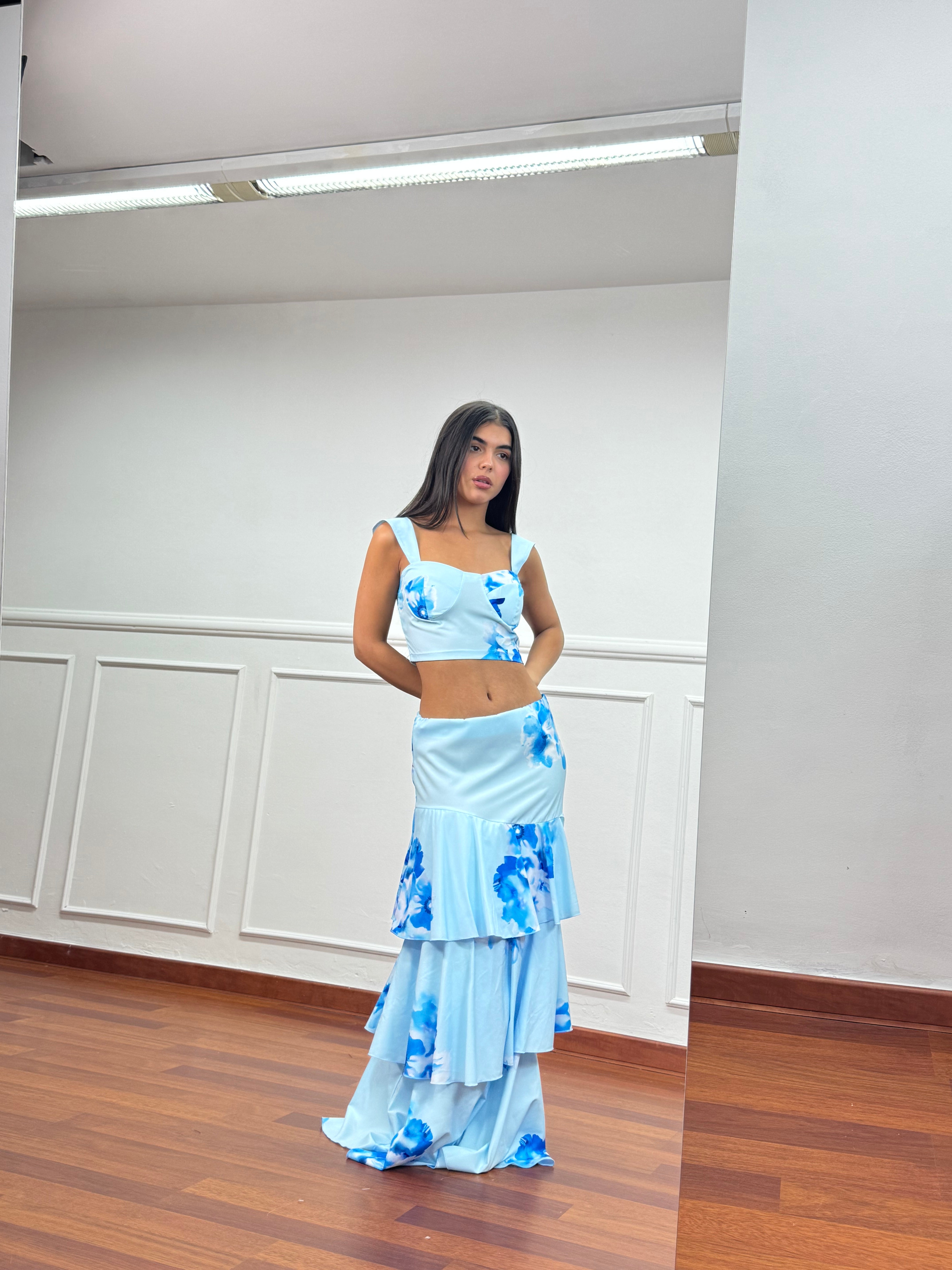 Questo coordinato dolce include un top azzurro e una gonna ampia e lunga, perfetto per un look elegante e raffinato. La gonna ampia offre un fit comodo e confortevole, mentre il top aggiunge un tocco di colore e stile. Ideale per un'occasione speciale o una giornata rilassante.