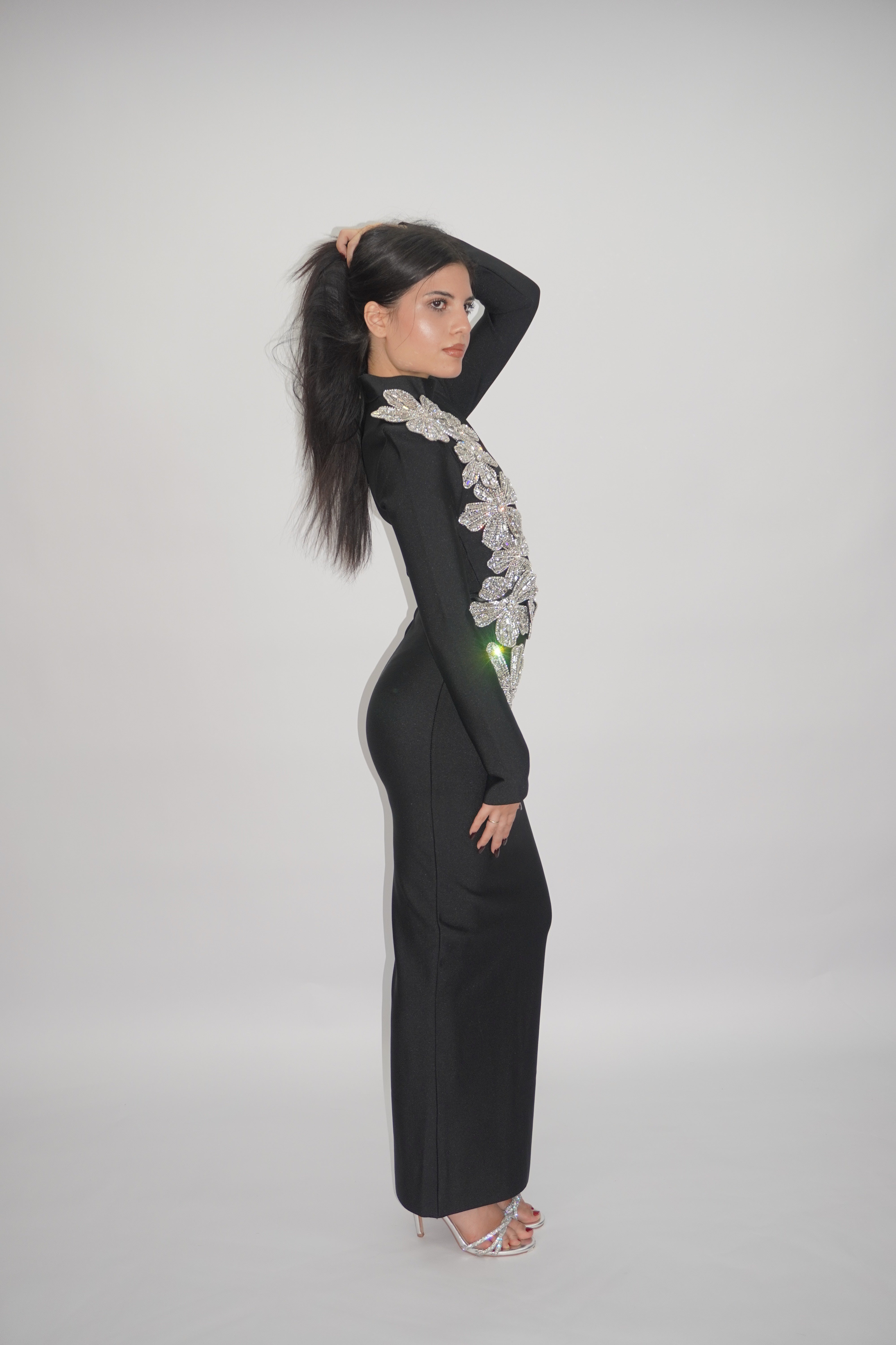 Un look audace e sofisticato che non passa inosservato. Questo coordinato bandage in tessuto elasticizzato valorizza le forme con una vestibilità aderente e scultorea. Il design è impreziosito da applicazioni floreali gioiello che creano un effetto luminoso e raffinato lungo la spalla, la vita e il fianco.
