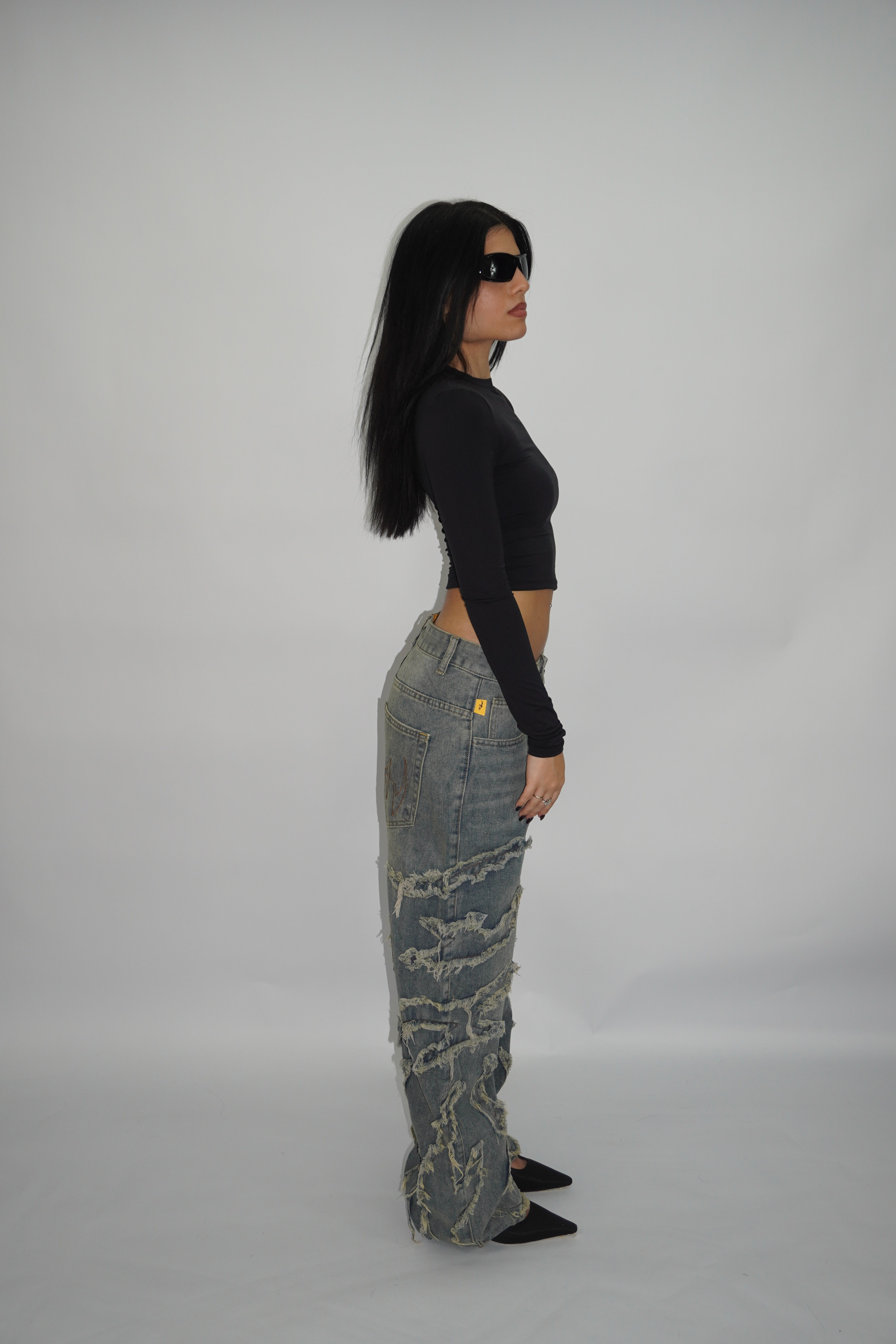 Questi jeans in denim lavaggio vintage si distinguono per l’effetto destroyed estremo con strappi e applicazioni sfrangiate su tutta la gamba, che donano un look vissuto e ribelle. La vestibilità baggy e la vita media garantiscono comodità e libertà di movimento, rendendoli ideali per outfit casual e urban.