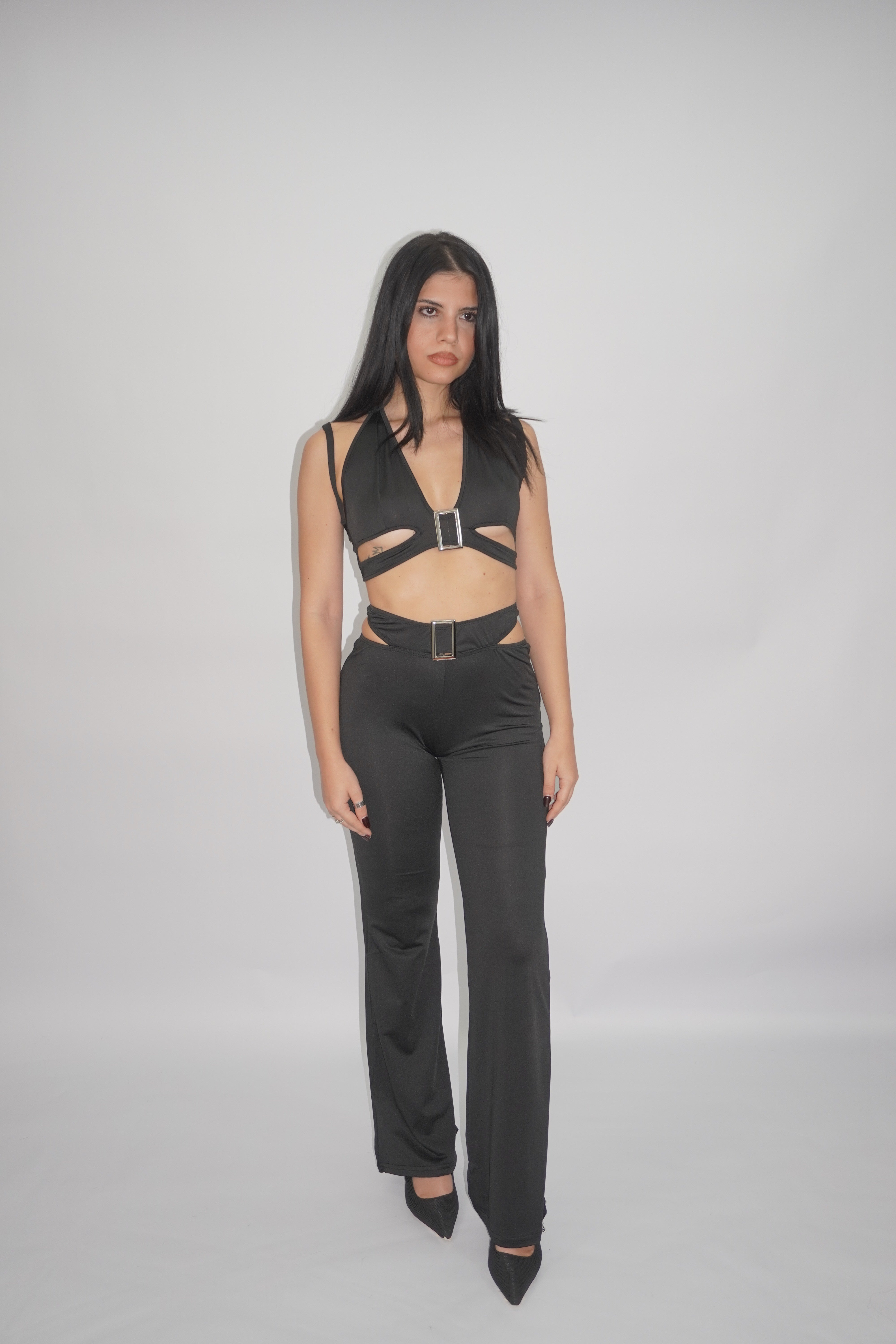 Distinguiti con questo audace completo nero a due pezzi, perfetto per serate glamour, eventi o uscite speciali. Il top crop con scollo profondo presenta dettagli cut-out strategici sul busto, impreziositi da una fibbia metallica centrale che aggiunge un tocco sofisticato e sensuale. I pantaloni a vita alta, con tagli laterali e fibbia coordinata, slanciano la figura grazie alla loro vestibilità aderente e svasata sul fondo.