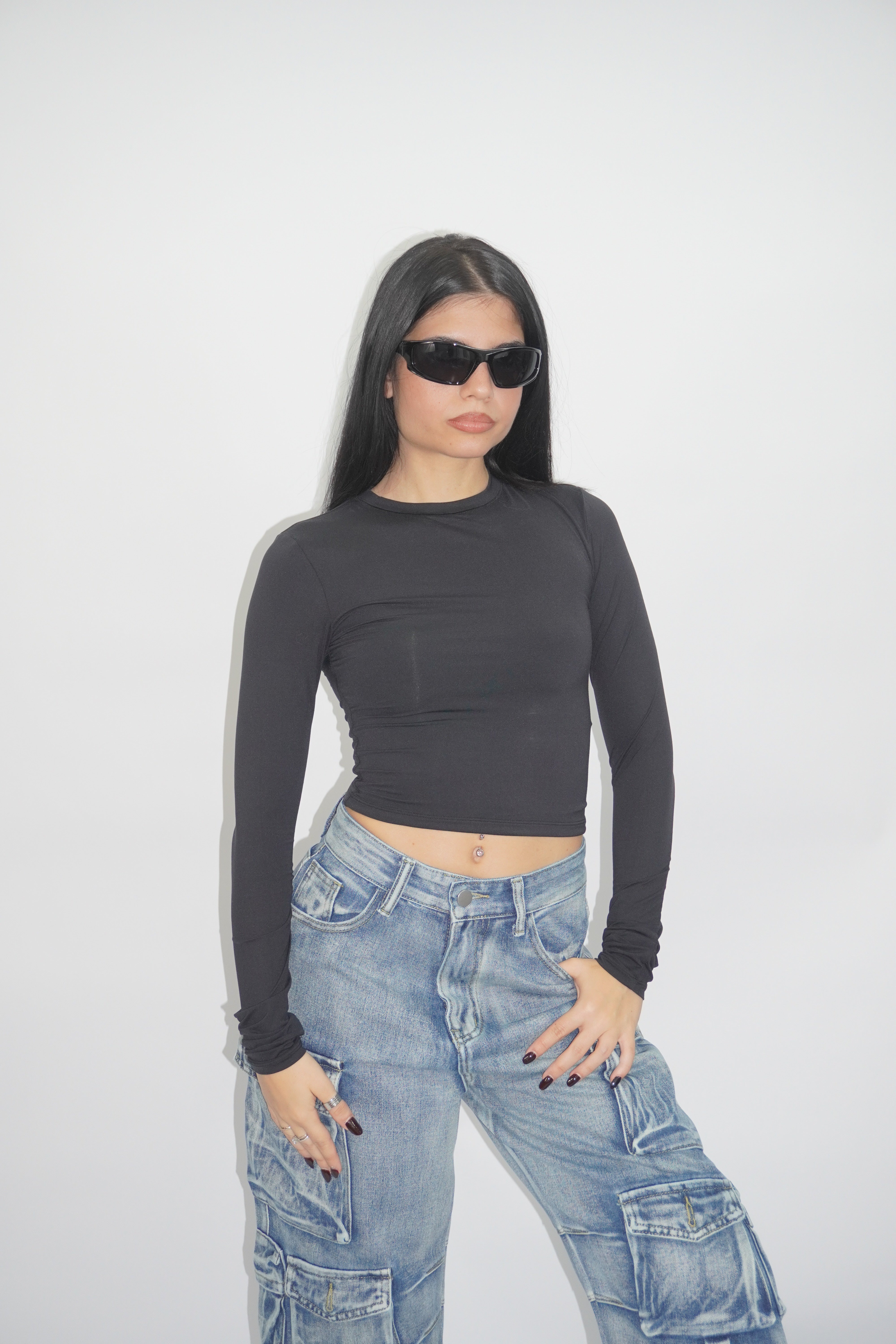 Dai un tocco minimal e trendy al tuo outfit con questa maglietta crop top a maniche lunghe. Realizzata in tessuto morbido ed elasticizzato, veste aderente e valorizza la silhouette senza rinunciare al comfort. Il design essenziale con collo leggermente alto e taglio corto la rende perfetta da abbinare a jeans a vita alta, pantaloni cargo o gonne.
