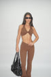 Il top corto halter presenta uno scollo profondo con twist centrale, un dettaglio sofisticato che esalta con delicatezza il décolleté.